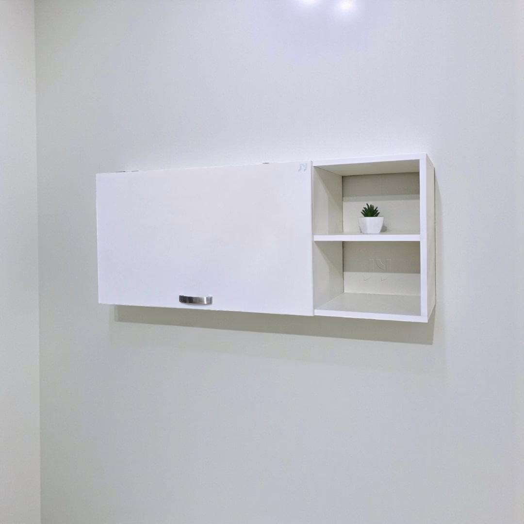 ⭐Repisa aérea con puerta 📐Dimensiones: 100cm largo x 41.5cm alto x 35cm fondo. -Incluye tacos Fischer y tornillos para fijar en la pared. 🖌️Color: blanco